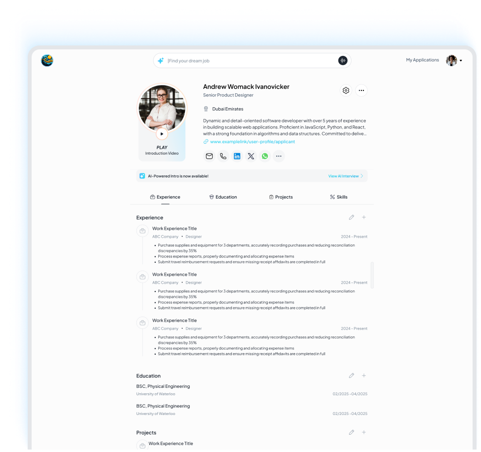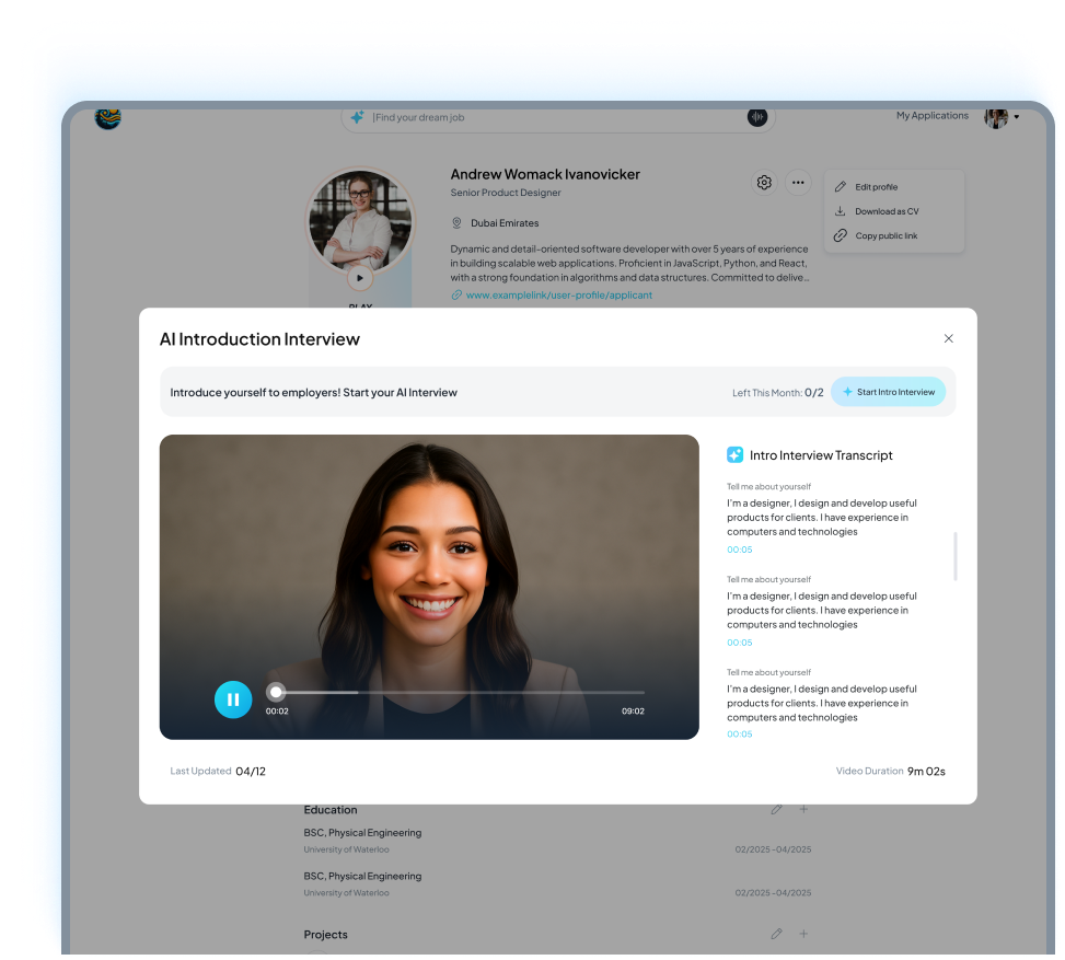 Apply with more than just a CV. Create your AI Interview once and start applying to jobs instantly — with scores, insights, and proof of performance.